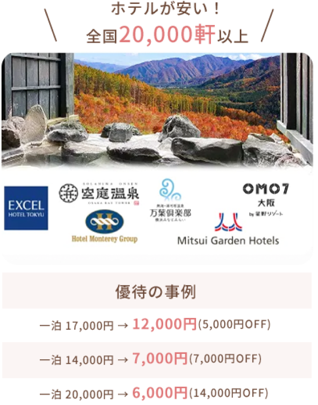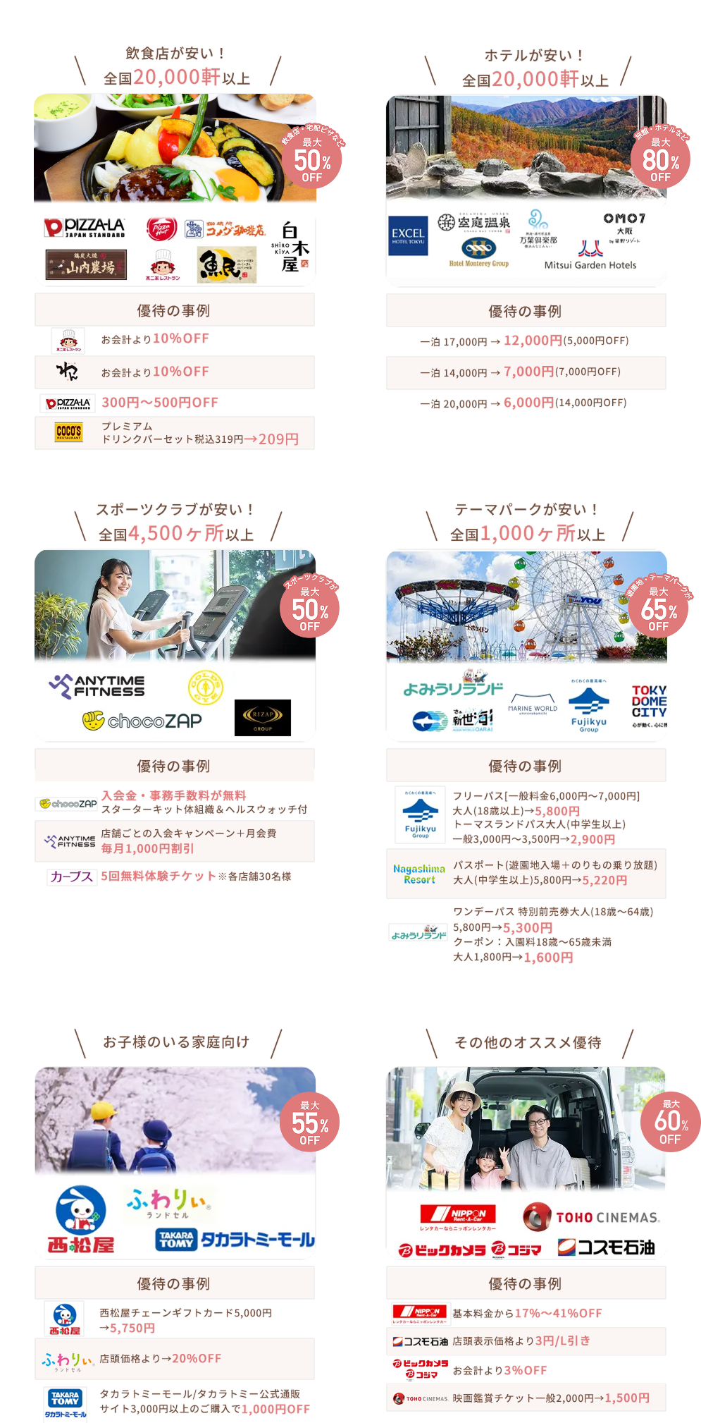 レストランやホテル、レジャー施設など、全国20万件以上の施設でご利用いただけます。旅行や日常の外食、休日のお出かけなど、さまざまなシーンでお使いいただけます。