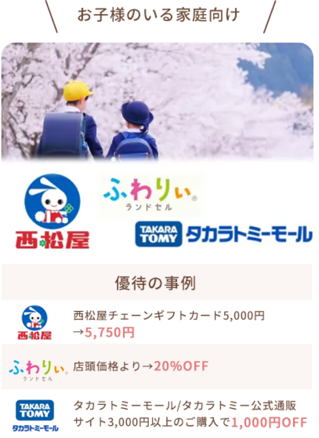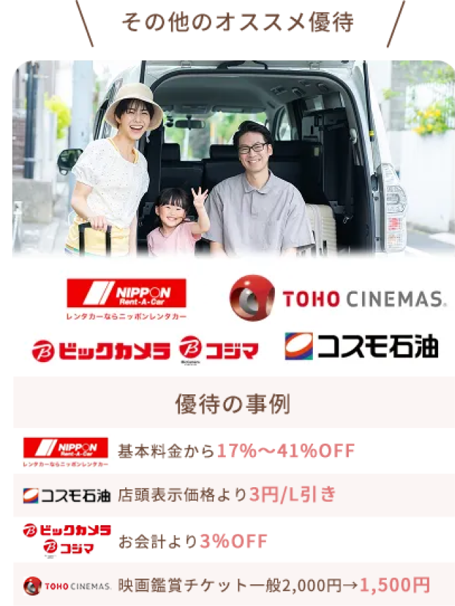はい、ご家族二親等までご利用可能です。ご夫婦はもちろん、お子様やご両親など、幅広く特典をご利用いただけるので、ご家族全員でお得を実感いただけます。